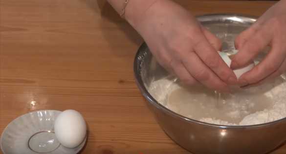Вливаем в муку воду с растворившейся до конца солью, разбиваем туда же 2 яйца и начинаем замешивать рукой