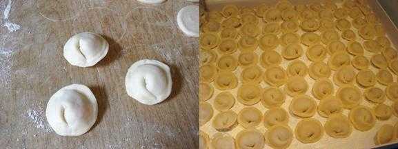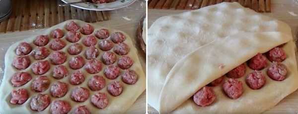 Разведите в небольшом количестве тёплой воды сухие дрожжи, добавьте сахар. Через 10 минут вылейте дрожжи в сделанное в муке углубление. Влейте туда же оставшуюся тёплую воду, вбейте яйца, добавьте размягченное сливочное масло и соль. Всё тщательно перемешайте и замесите мягкое и вязкое тесто. Накройте его сверху чистым полотенцем и оставьте при комнатной температуре на 40–50 мин. Когда тесто поднимется в 2 раза, разделите его на небольшие кусочки величиной с кулак и раскатайте их в виде пластов. Разрежьте пласты на полосы шириной 3 см, затем из них вырежьте стаканом заготовки для пельменей и приступайте к приготовлению пельменей.