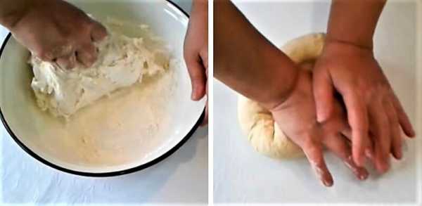 Когда в емкости уже не осталось сухой муки, «смачиваем» руки в оставленной нами муке, немножко присыпаем тесто и, отложив вилку, начинаем его вымешивать на присыпанной поверхности рабочего стола до тех пор, пока оно не будет упругим и одновременно мягким.