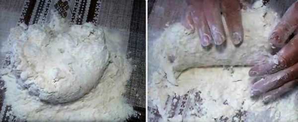Когда почти вся мука вмешана — перекладываем на стол и продолжаем месить руками