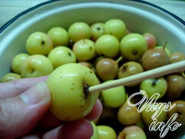- Кожицу каждой ранетки наколоть в нескольких местах деревянной зубочисткой.