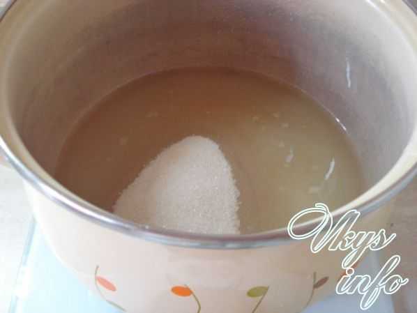 Через 8 часов можно процесс продолжить. Сахар залейте водой в толстостенной посуде. Отправьте емкость на огонь, и часто помешивая, доведите до кипения ее содержимое. Проварите сироп в течение 5 минут. Необходимо добиться полного растворения сахарных кристалликов.