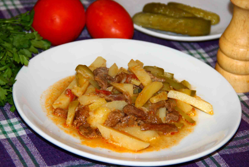Азу – это традиционное татарское блюдо, которое состоит из обжаренных кусочков мяса, овощей, жареного картофеля, с добавлением соленых огурцов и томатного соуса.
