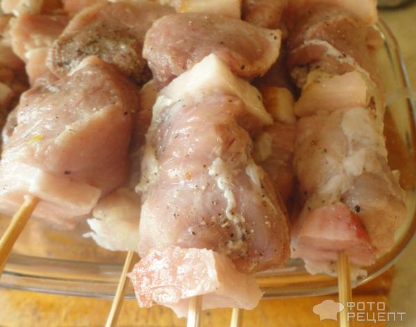 4. Берем заранее приготовленные шпажки и нанизываем на них свинину кусочек за кусочком. На одной шпажке должно уместится 4-5 кусочков в зависимости от их размера. Обязательно нужно следить за тем, что бы один конец шпажки был скрыт куском свинины. Для этого я продеваю первый кусок мяса не до конца шпажки, иначе можно поцарапать чашу.