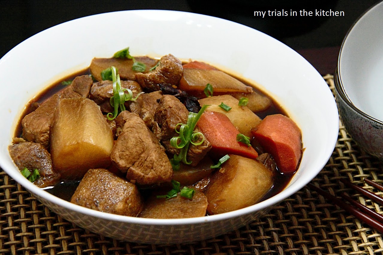Удалите со свинины лишний жир, нарежьте мясо крупными кусками и выложите в сковороду. Влейте бульон, смешанный с томатной пастой. Приправьте солью по вкусу. Убавьте огонь и доведите до кипения. Затем накройте сковороду крышкой и поставьте в разогретую до 180 °C духовку на 2,5–3 часа, пока мясо не станет очень мягким.
