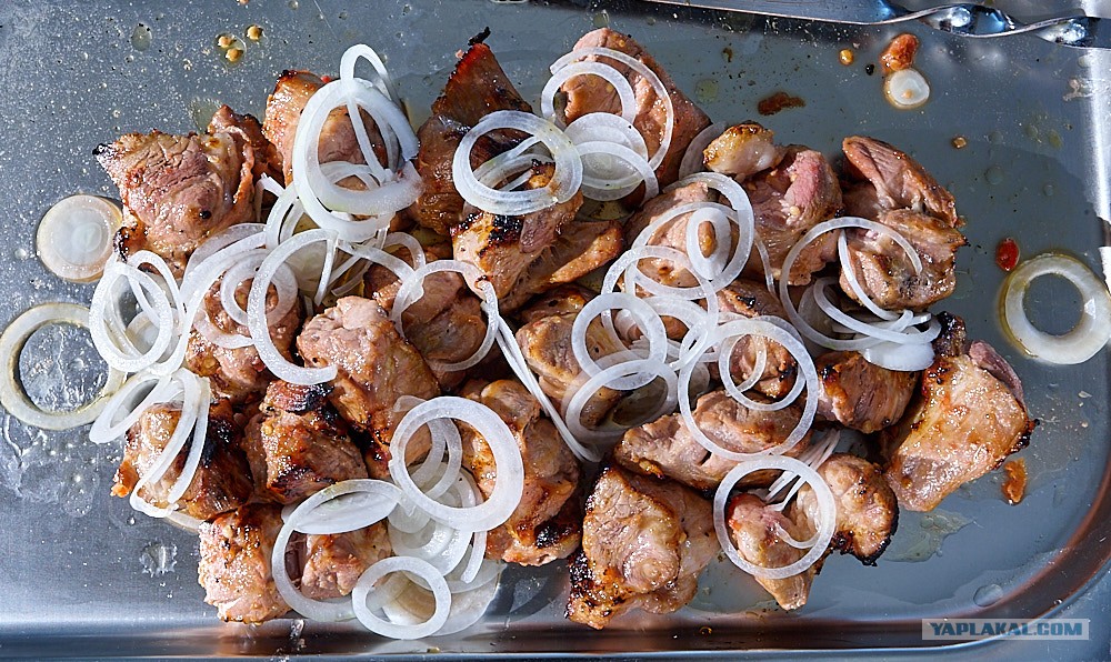 - У вас останется много нарезанного лука, оставшегося от маринада. Его очень вкусно жарить на сковороде или на гриле, его можно подавать как гарнир к шашлыку.